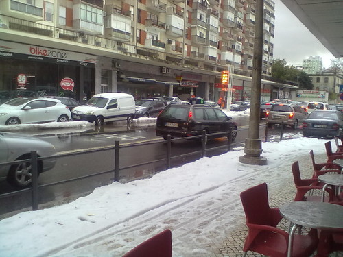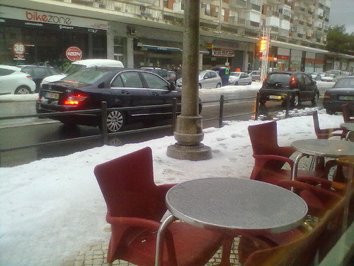Estava a começar a abrir os olhos quando o meu pai me manda esta fotografia a dizer «Esplanada na neve, só na Balalaika» e eu aqui a 100 kms de distância! Levantei num salto e já investiguei a coisa. Afinal foi granizo, mas digam lá se não está lindo?
